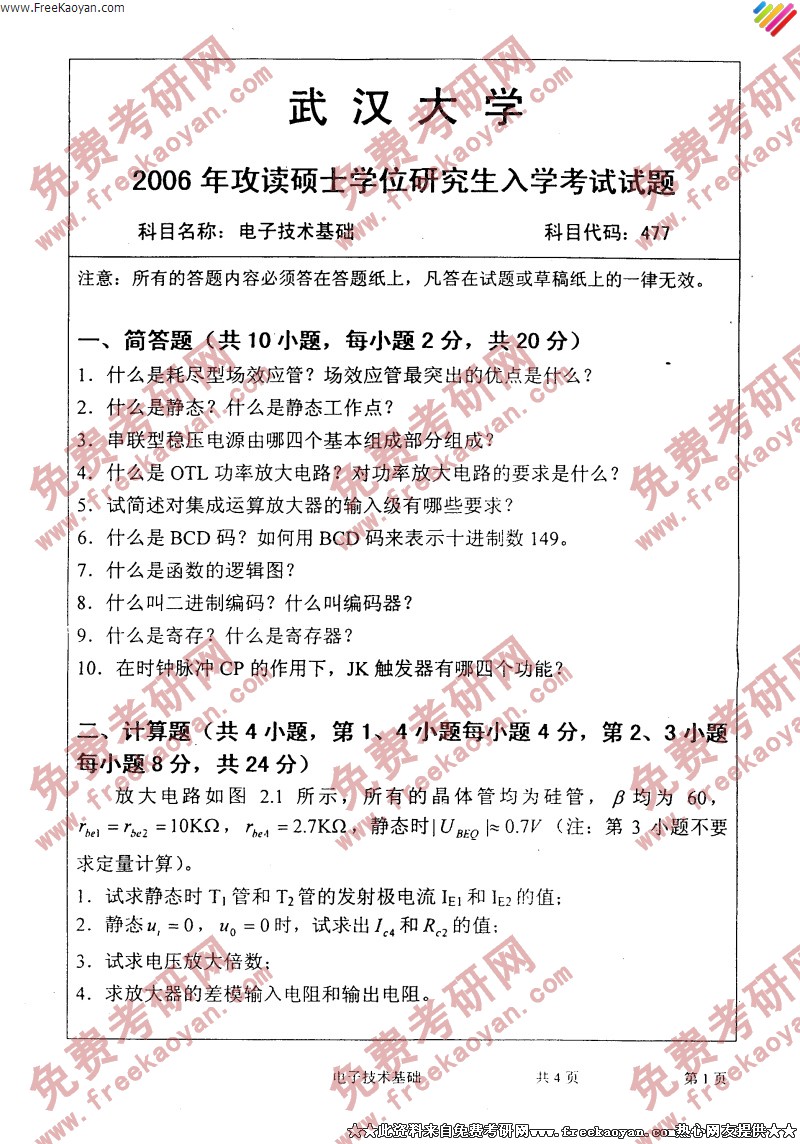 武汉大学2006年考研真题-电子技术基础