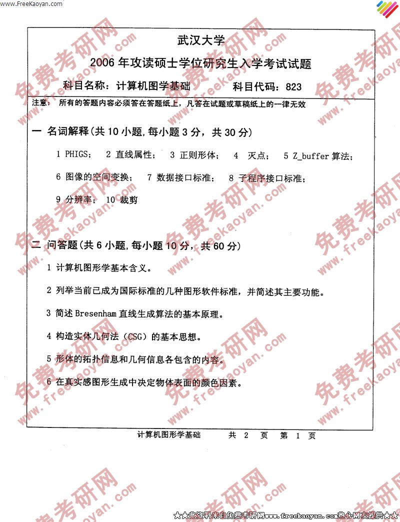 武汉大学2006年考研真题-计算机图学基础