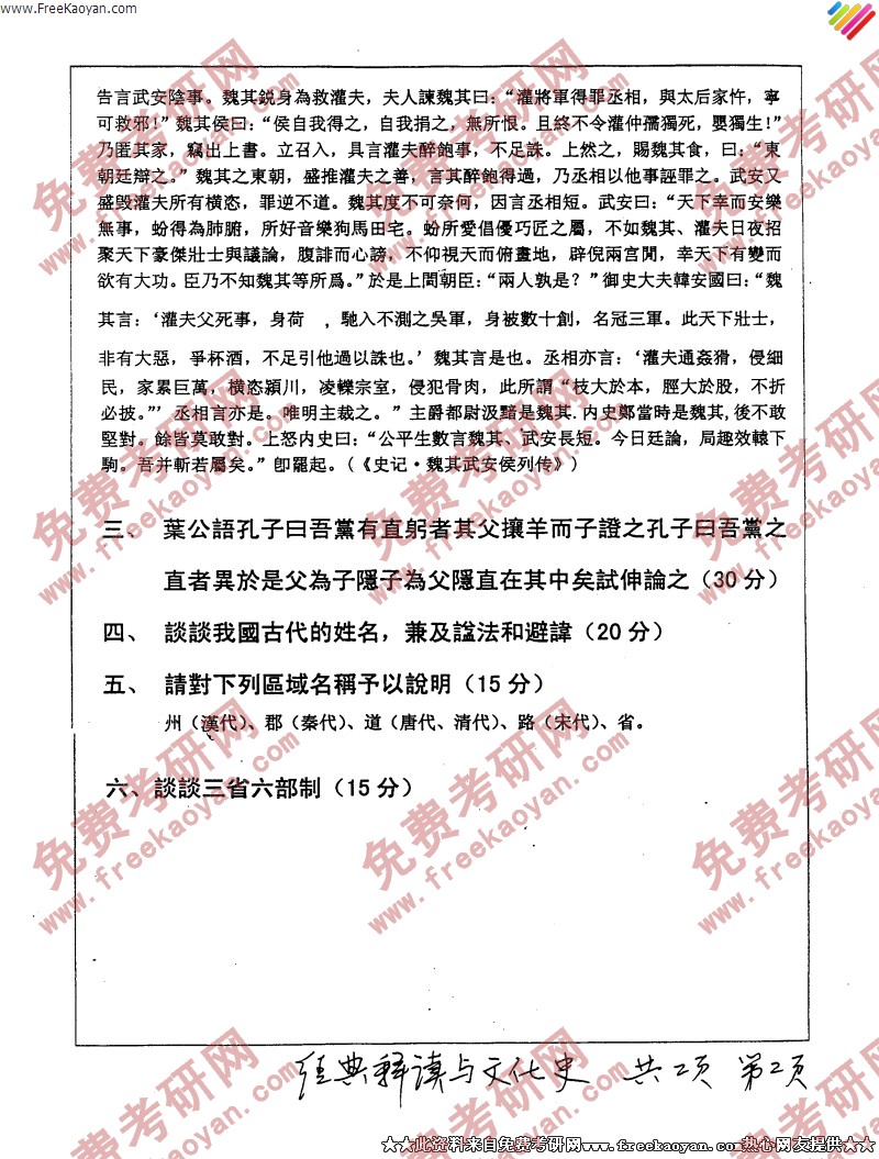 专业课考研经验 本站小编 FreeKaoyan 2018-01-22武汉大学2006年考研真题-典籍与文化综合知识
