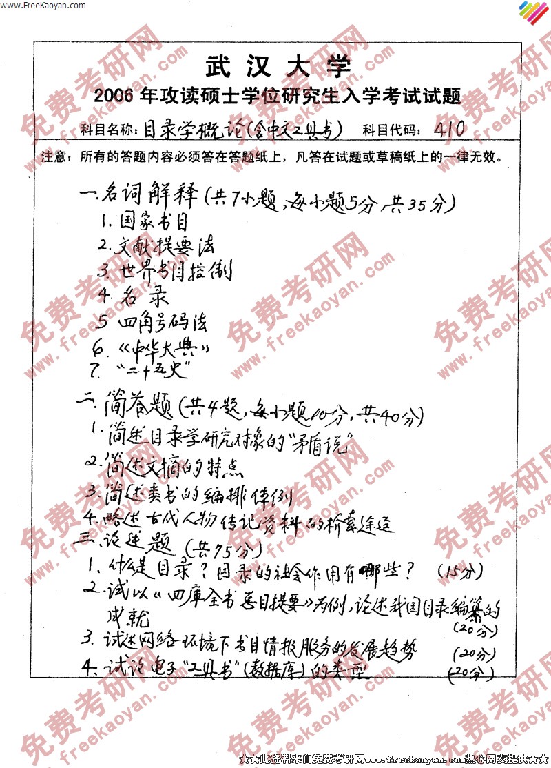 专业课考研经验 本站小编 FreeKaoyan 2018-01-22武汉大学2006年考研真题-典籍与文化综合知识