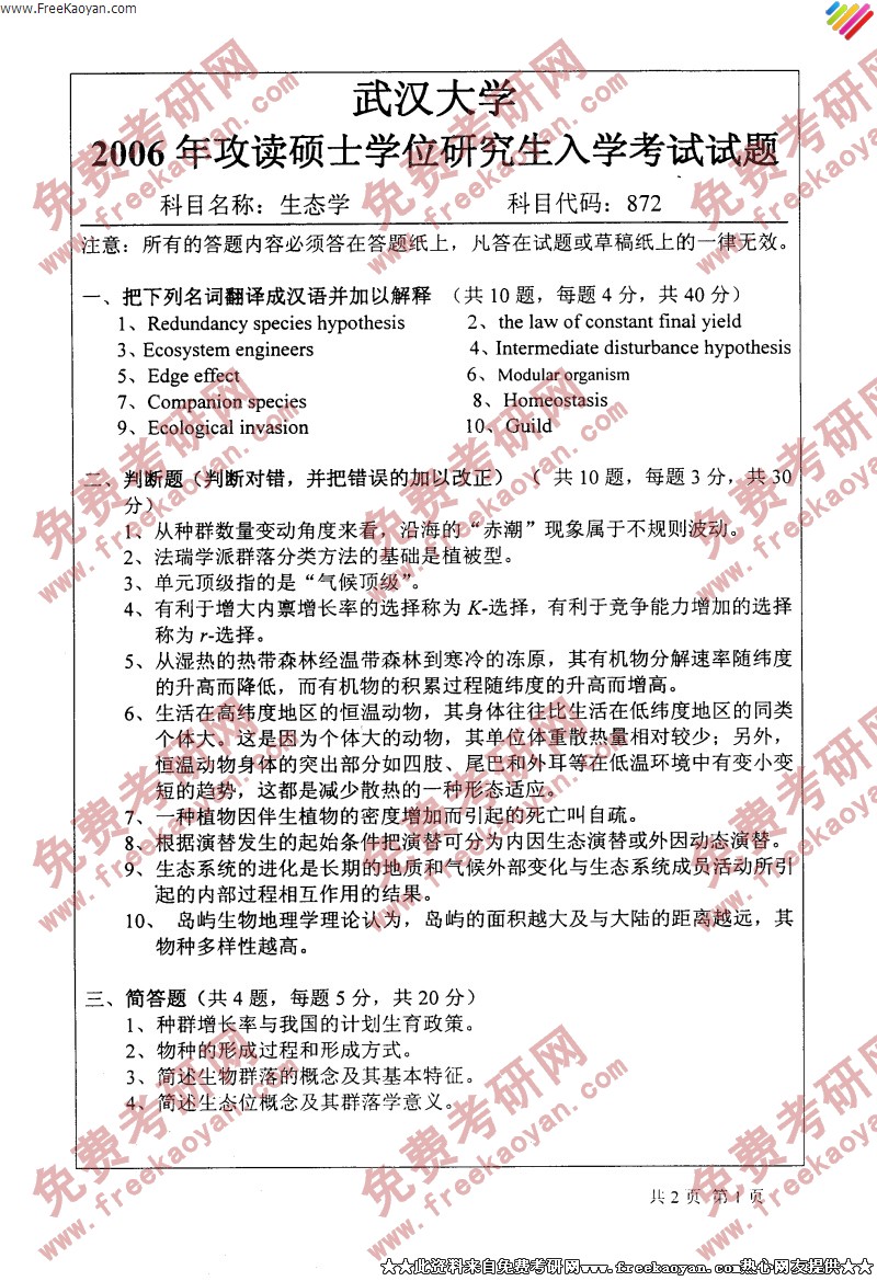 专业课考研经验 本站小编 FreeKaoyan 2018-01-22武汉大学2006年考研真题-普通生物学