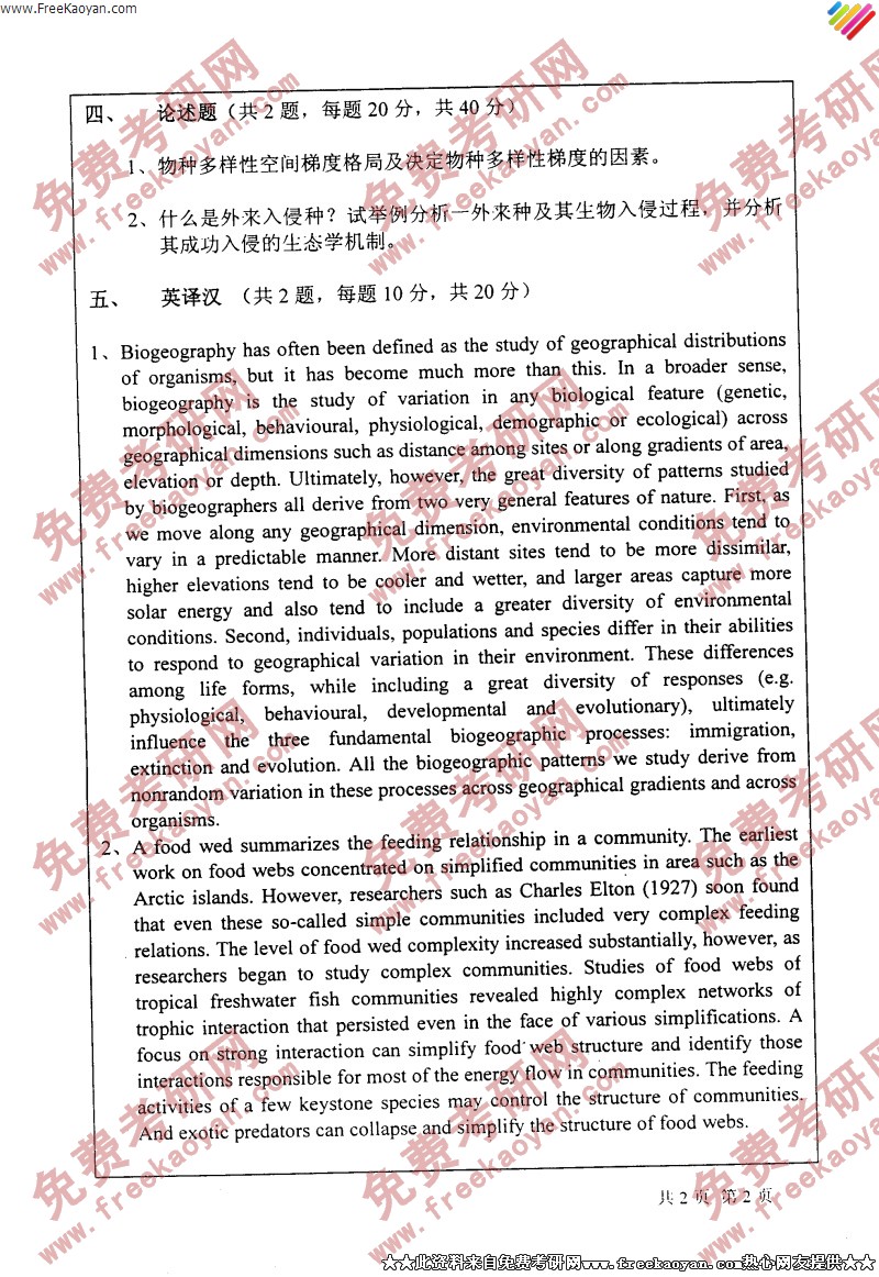 专业课考研经验 本站小编 FreeKaoyan 2018-01-22武汉大学2006年考研真题-普通生物学
