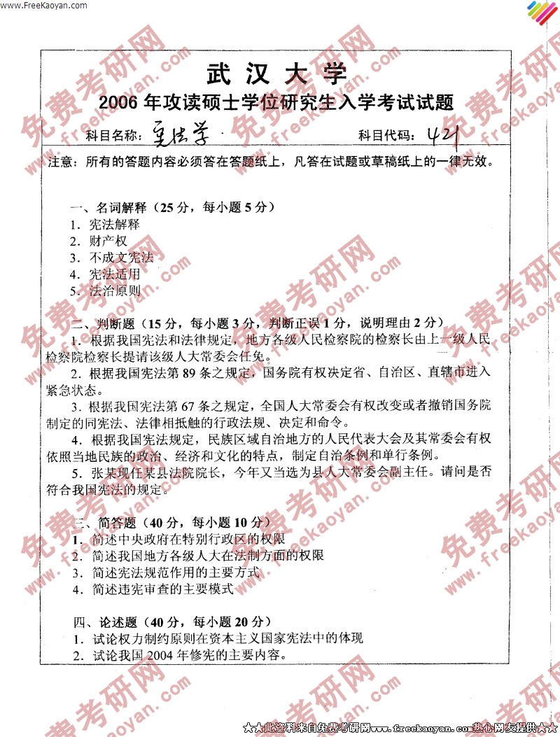 专业课考研经验 本站小编 FreeKaoyan 2018-01-22武汉大学2006年考研真题-法理学