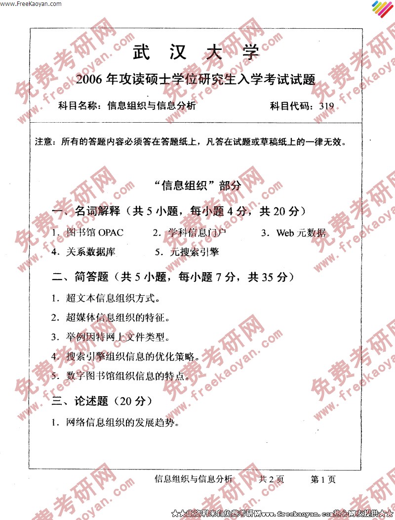 专业课考研经验 本站小编 FreeKaoyan 2018-01-22武汉大学2006年考研真题-图书馆学基础(含中国图书和图书馆史、分类学)