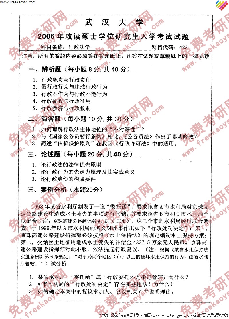 专业课考研经验 本站小编 FreeKaoyan 2018-01-22武汉大学2006年考研真题-宪法学