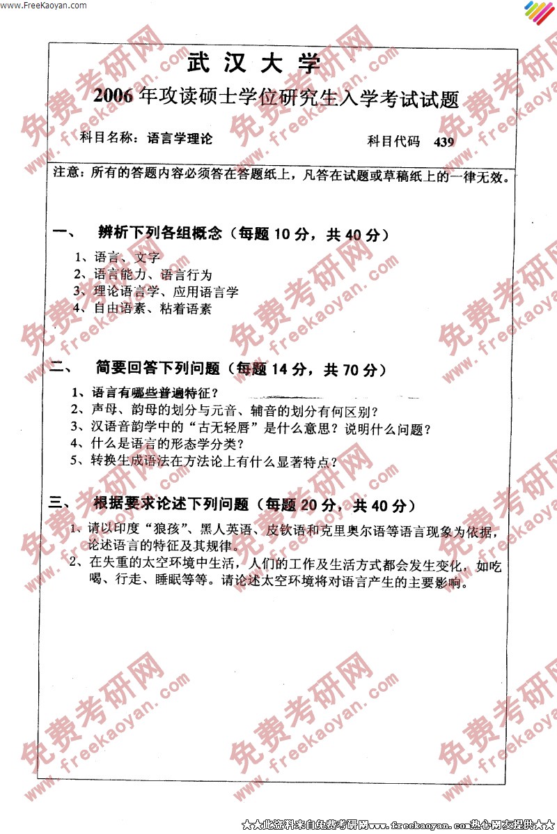 武汉大学2006年考研真题-语言学理论
