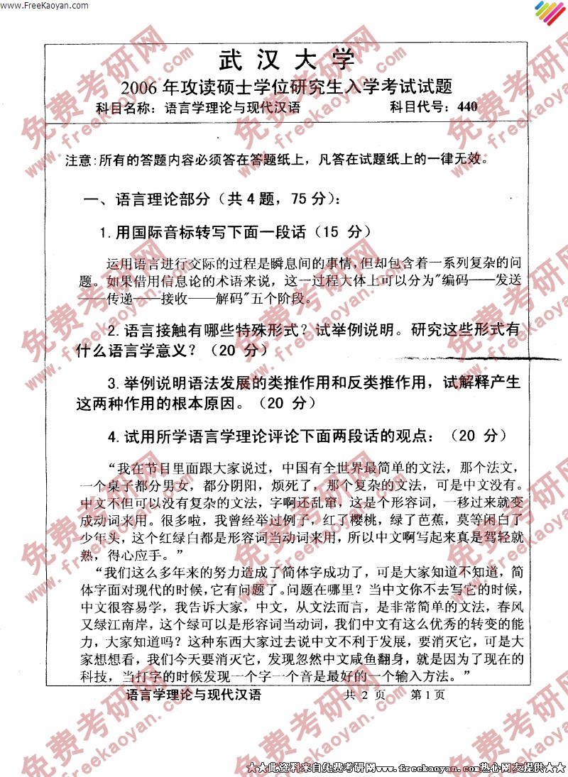 专业课考研经验 本站小编 FreeKaoyan 2018-01-22武汉大学2006年考研真题-语言学理论