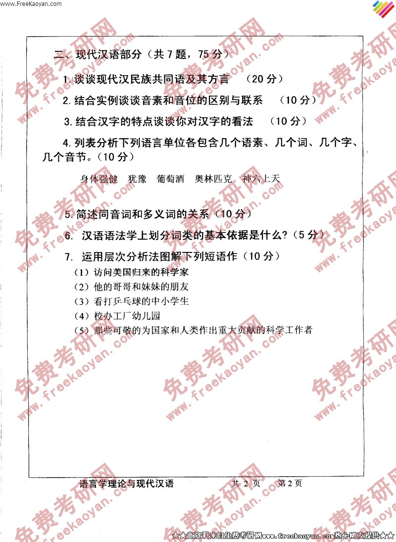 武汉大学2006年考研真题-语言学理论与现代汉语(2)