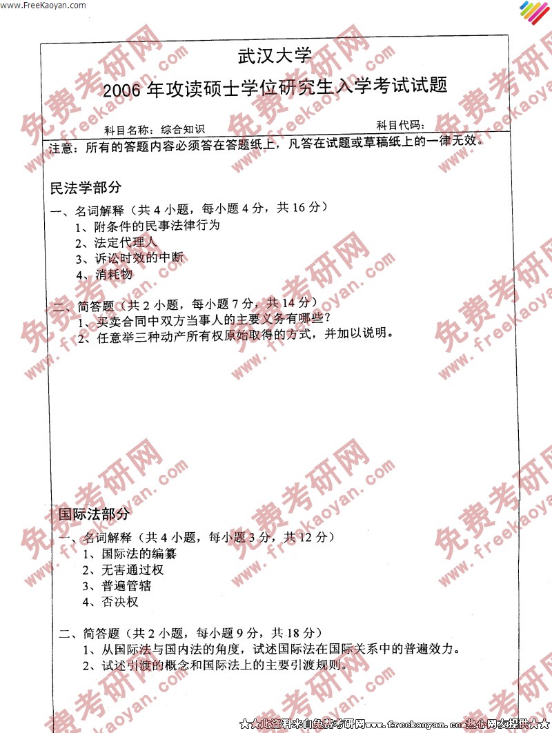 武汉大学2006年考研真题-综合知识(含法理学、宪法学、民法学、刑法学、国际法)(2)