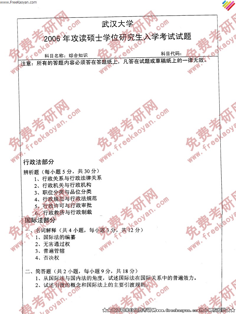 专业课考研经验 本站小编 FreeKaoyan 2018-01-22武汉大学2006年考研真题-综合知识(含法理学、宪法学、民法学、刑法学、国际法)