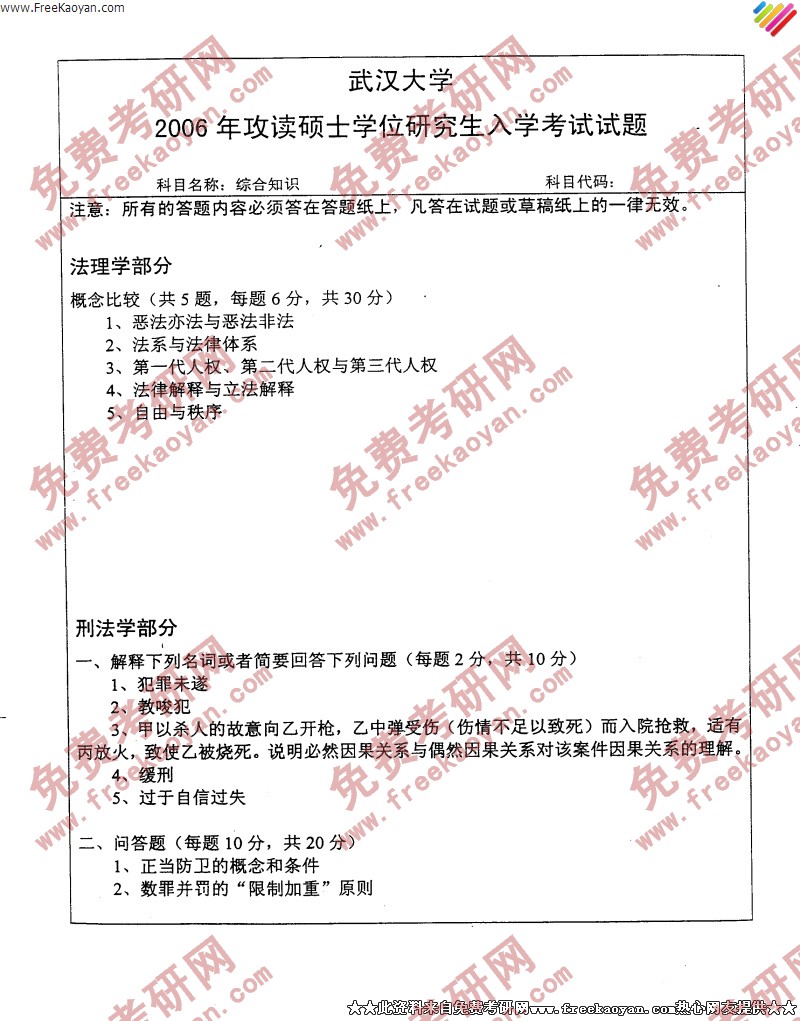 专业课考研经验 本站小编 FreeKaoyan 2018-01-22武汉大学2006年考研真题-综合知识(含法理学、宪法学、民法学、刑法学、国际法)