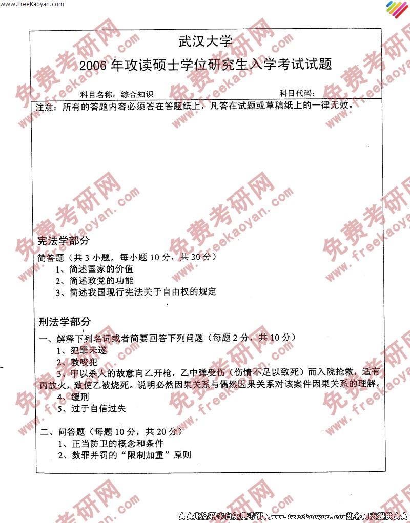 专业课考研经验 本站小编 FreeKaoyan 2018-01-22武汉大学2006年考研真题-综合知识(含法理学、宪法学、民法学、刑法学、国际法)