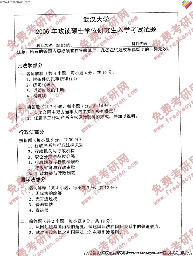 专业课考研经验 本站小编 FreeKaoyan 2018-01-22武汉大学2006年考研真题-综合知识(含法理学、行政法、刑法学、民法学、国际法)