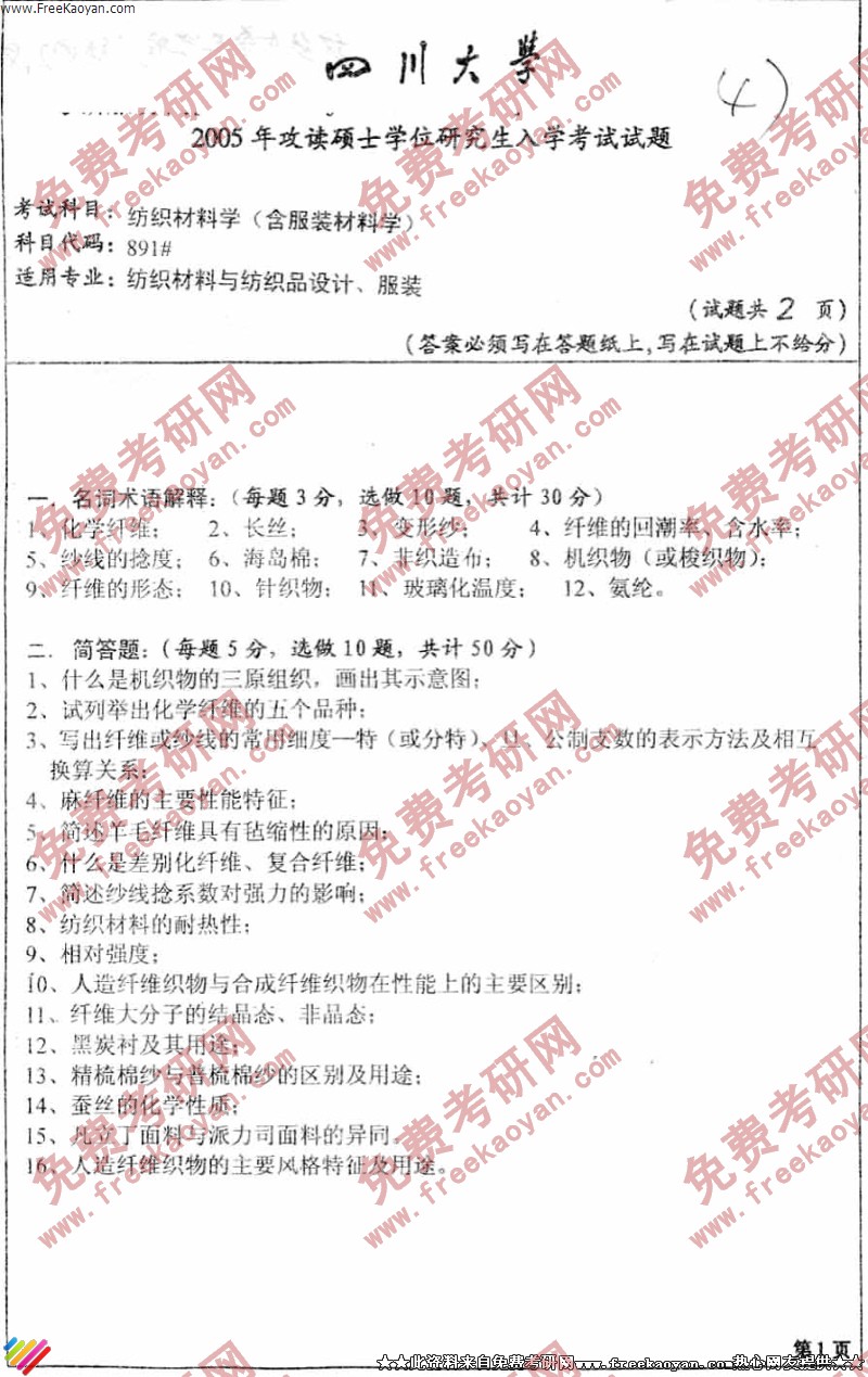 相关话题/材料学 考研真题 四川大学 服装 纺织
