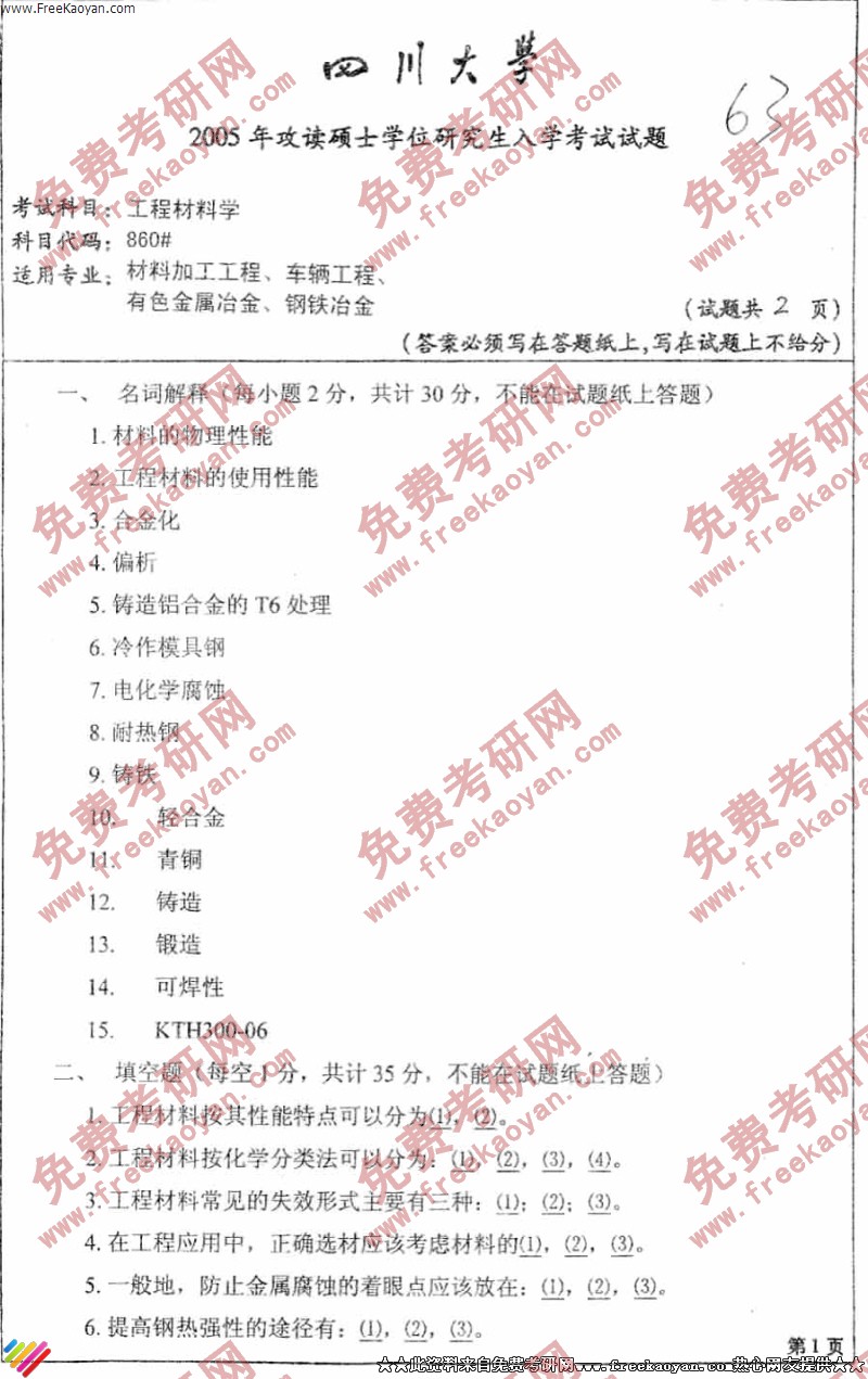 专业课考研经验 本站小编 FreeKaoyan 2018-01-22四川大学2005年考研真题-材料科学基础(一)