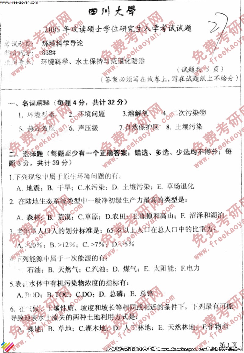 专业课考研经验 本站小编 FreeKaoyan 2018-01-22四川大学2005年考研真题-环境工程