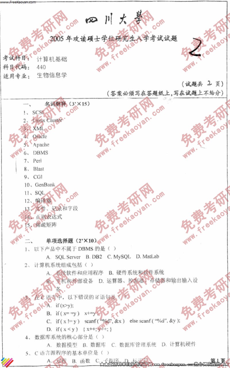 专业课考研经验 本站小编 FreeKaoyan 2018-01-22四川大学2005年考研真题-环境工程