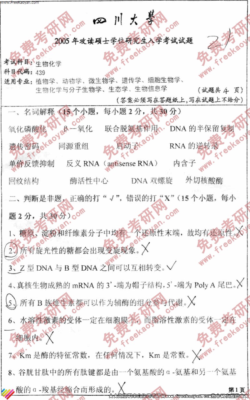 专业课考研经验 本站小编 FreeKaoyan 2018-01-22四川大学2005年考研真题-农药学(分析化学)