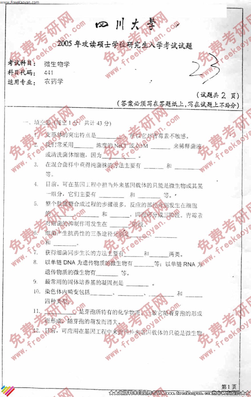 专业课考研经验 本站小编 FreeKaoyan 2018-01-22四川大学2005年考研真题-生物学