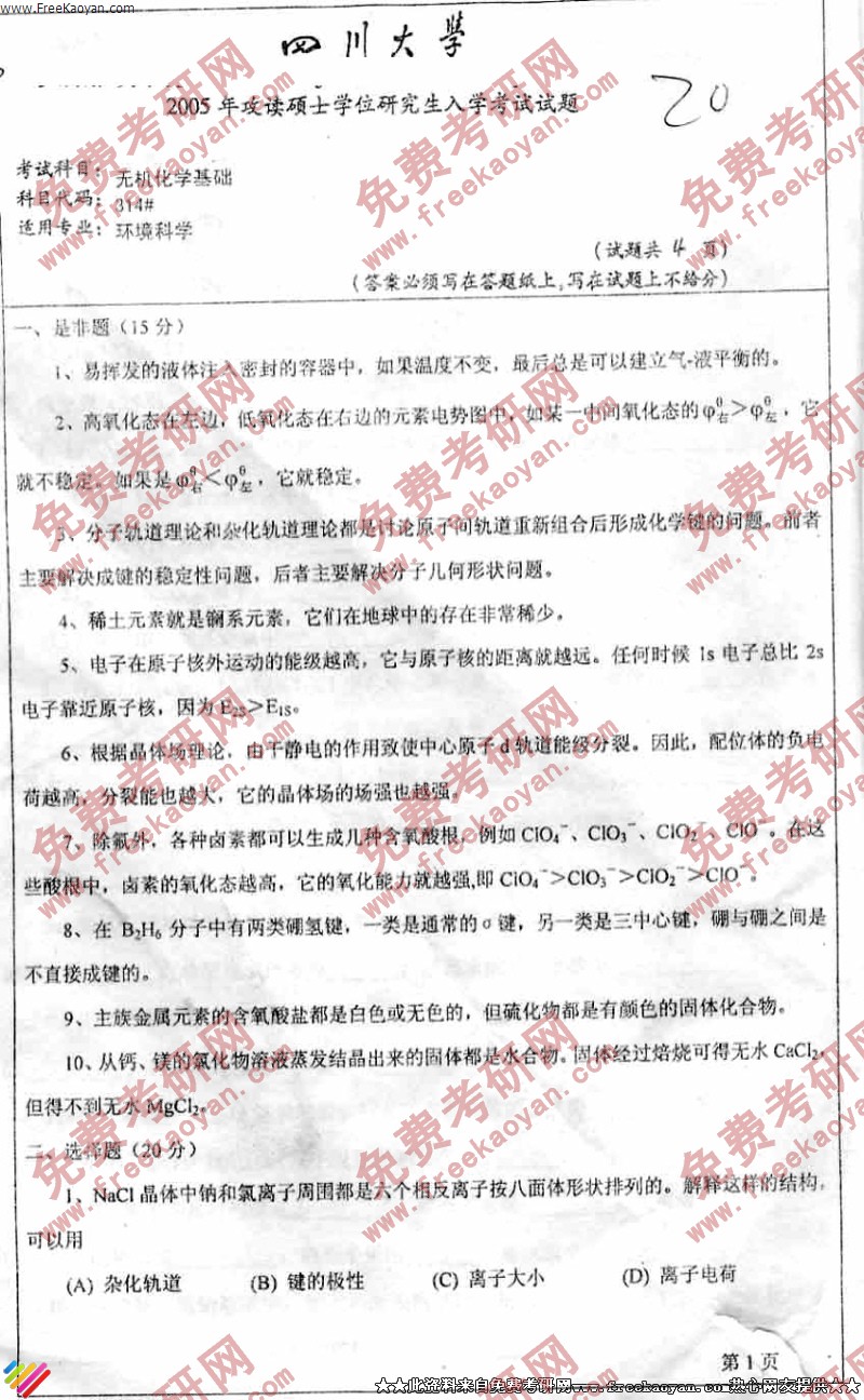 专业课考研经验 本站小编 FreeKaoyan 2018-01-22四川大学2005年考研真题-数学(有答案)