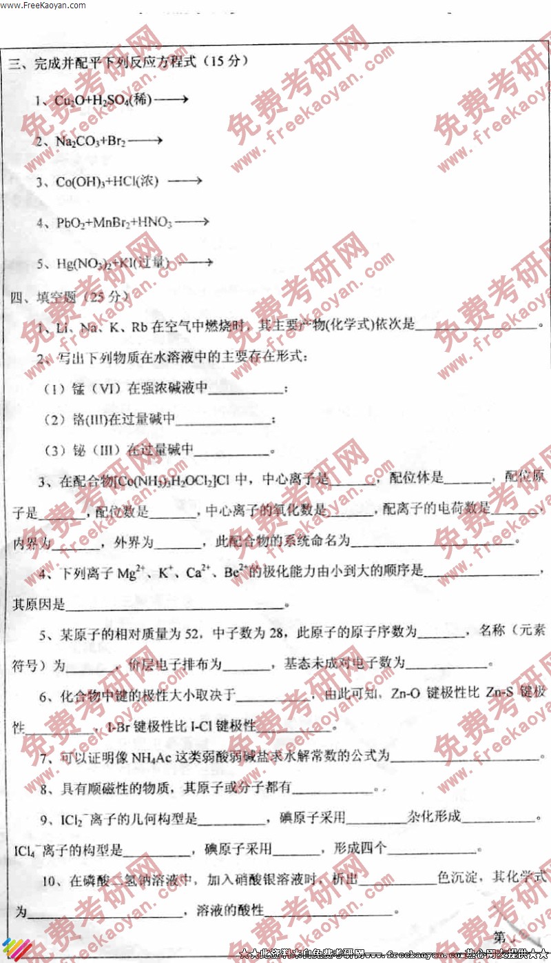 相关话题/考研真题 四川大学 基础 无机化学