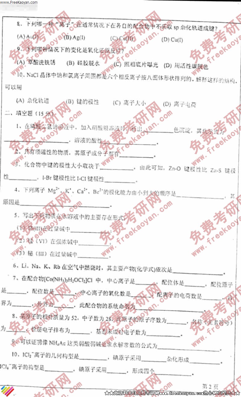 专业课考研经验 本站小编 FreeKaoyan 2018-01-22四川大学2005年考研真题-无机化学基础