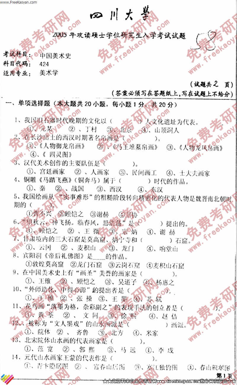 专业课考研经验 本站小编 FreeKaoyan 2018-01-22四川大学2005年考研真题-艺术学院综合考试
