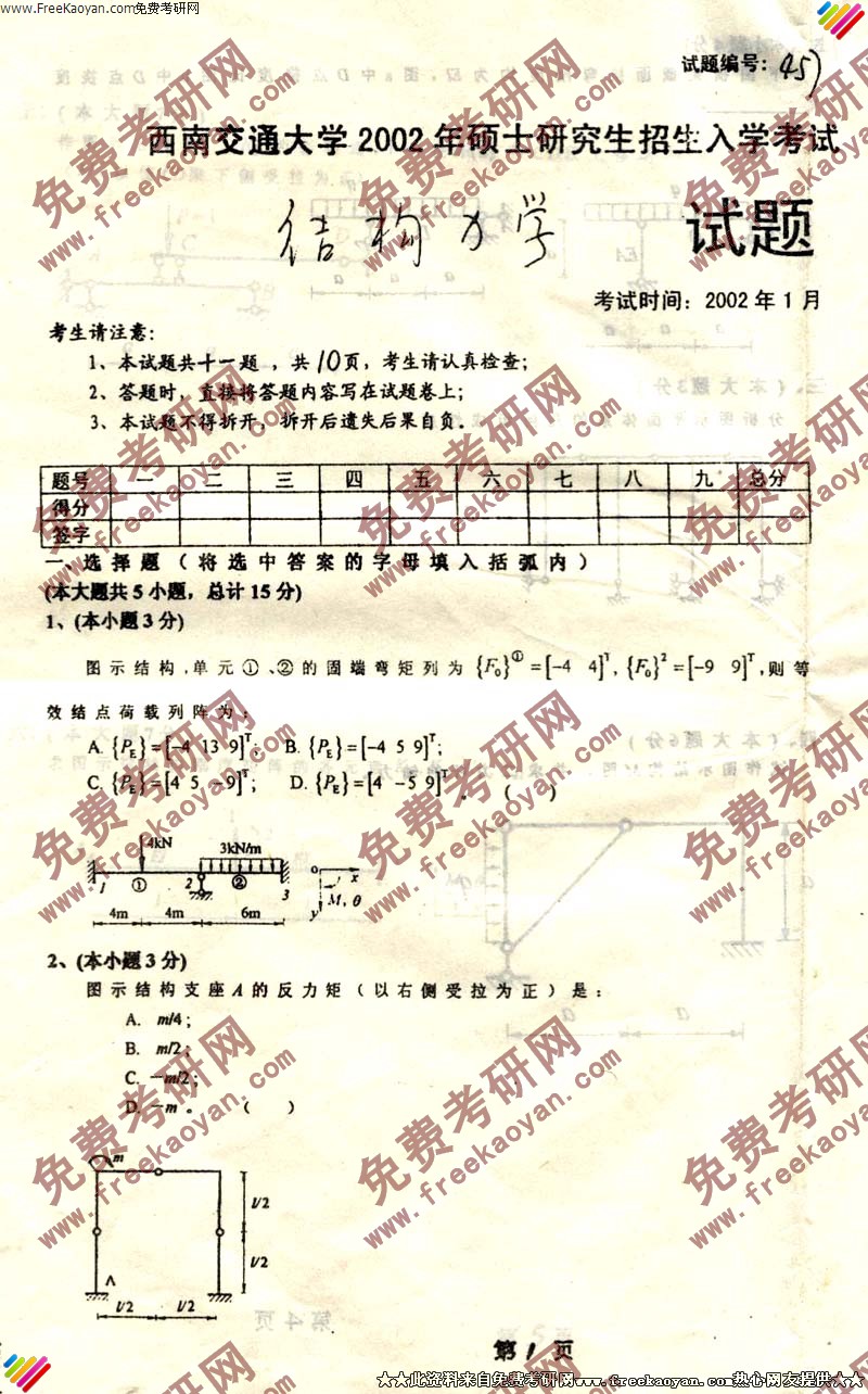 专业课考研经验 本站小编 FreeKaoyan 2018-01-22西南交通大学2001年考研真题-材料力学