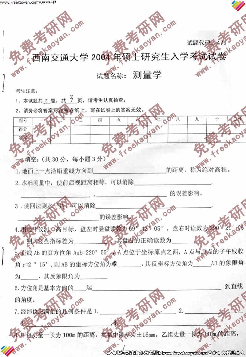 专业课考研经验 本站小编 FreeKaoyan 2018-01-22西南交通大学2003年考研真题-测量学试题