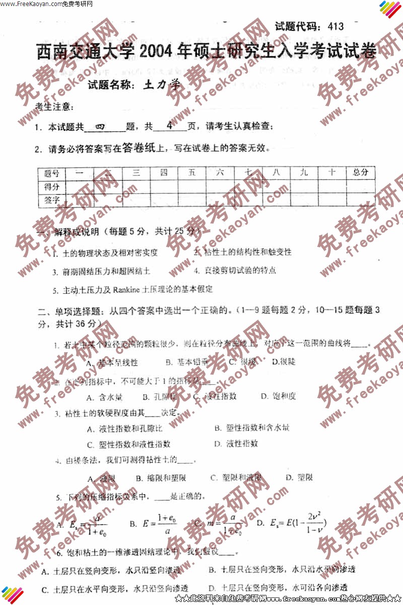 专业课考研经验 本站小编 FreeKaoyan 2018-01-22西南交通大学2003年考研真题-土力学试题
