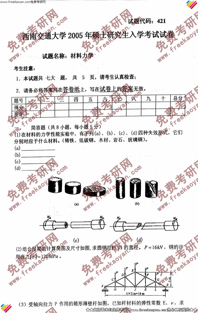 专业课考研经验 本站小编 FreeKaoyan 2018-01-22西南交通大学2004年考研真题-材料力学试题