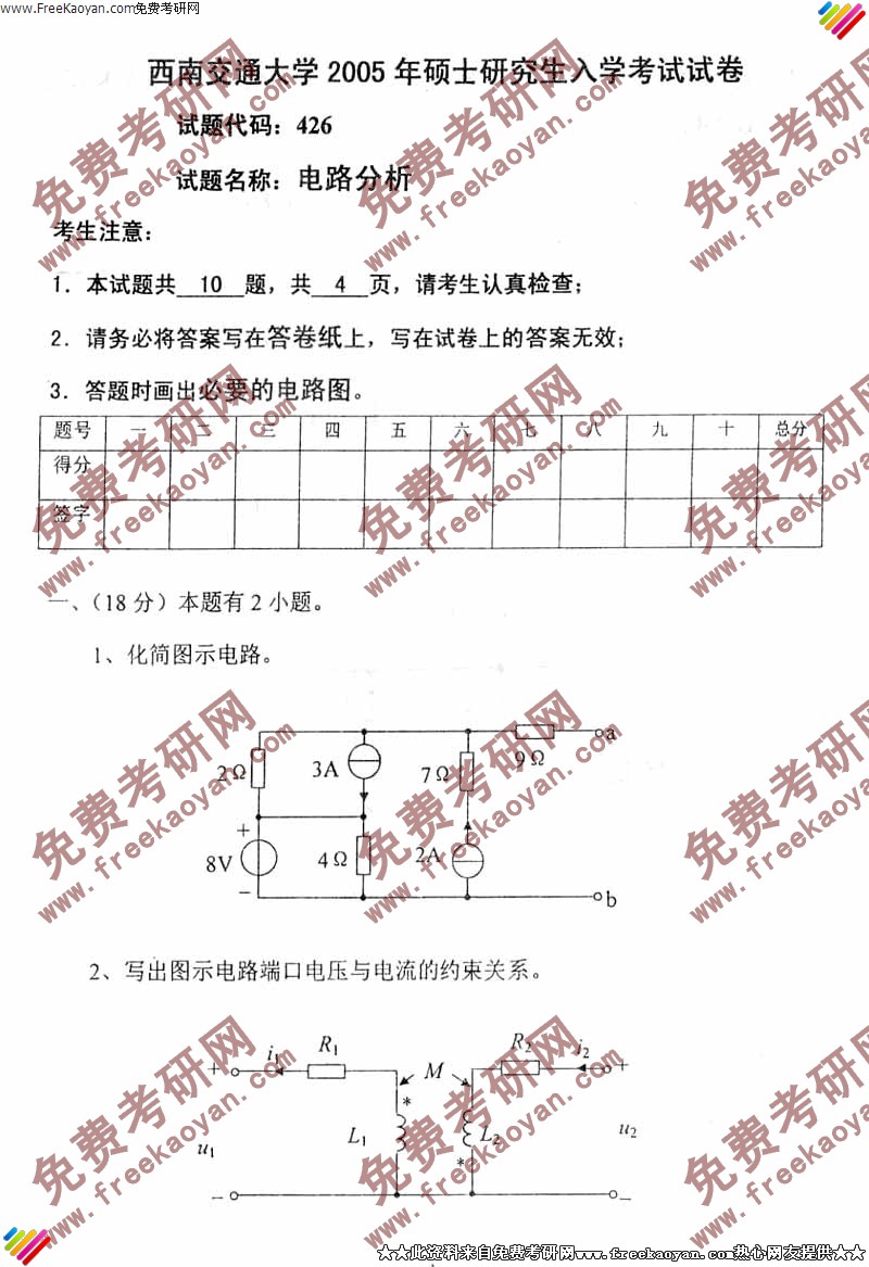 西南交通大学2005年考研真题-电路分析试题