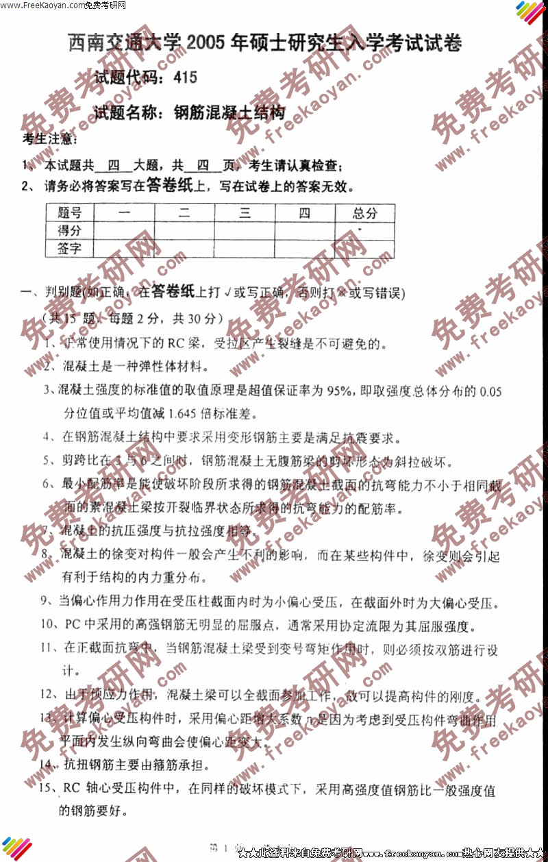 西南交通大学2005年考研真题-钢筋混凝土结构试题