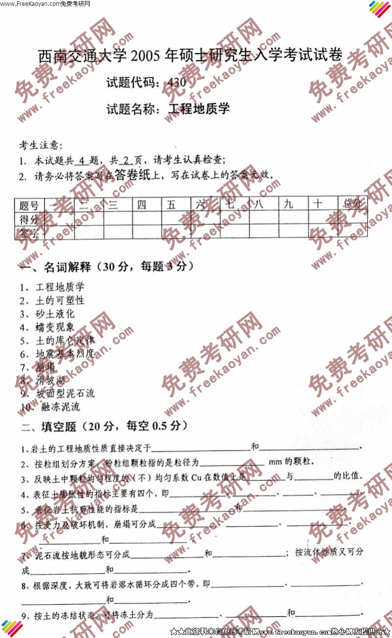 专业课考研经验 本站小编 FreeKaoyan 2018-01-22西南交通大学2004年考研真题-工程地质学试题
