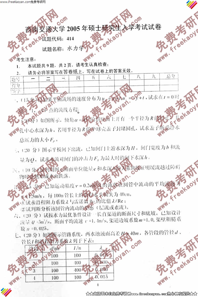 专业课考研经验 本站小编 FreeKaoyan 2018-01-22西南交通大学2004年考研真题-水力学试题