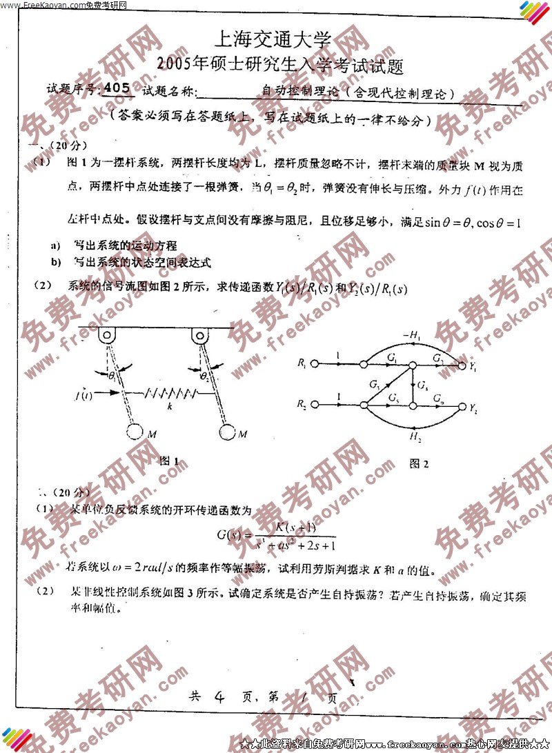 上海交通大学2005年考研真题-自动控制理论(含现代控制)