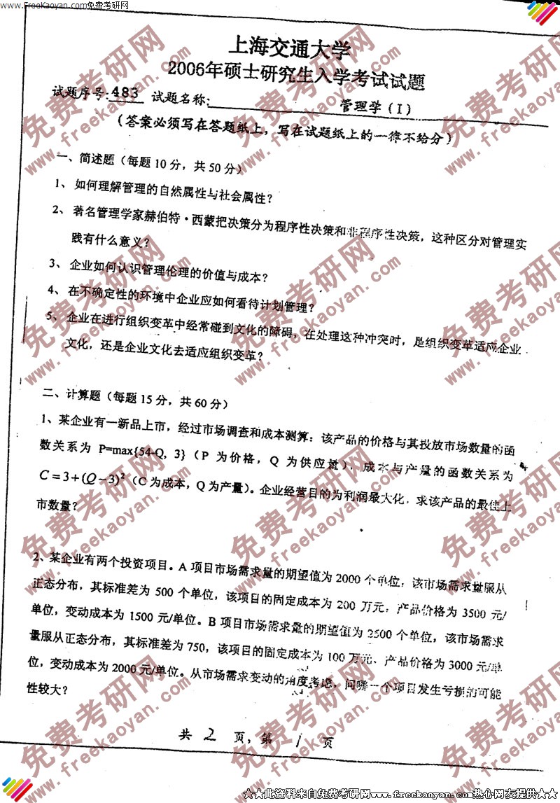 专业课考研经验 本站小编 FreeKaoyan 2018-01-22上海交通大学2005年考研真题-管理学(I)