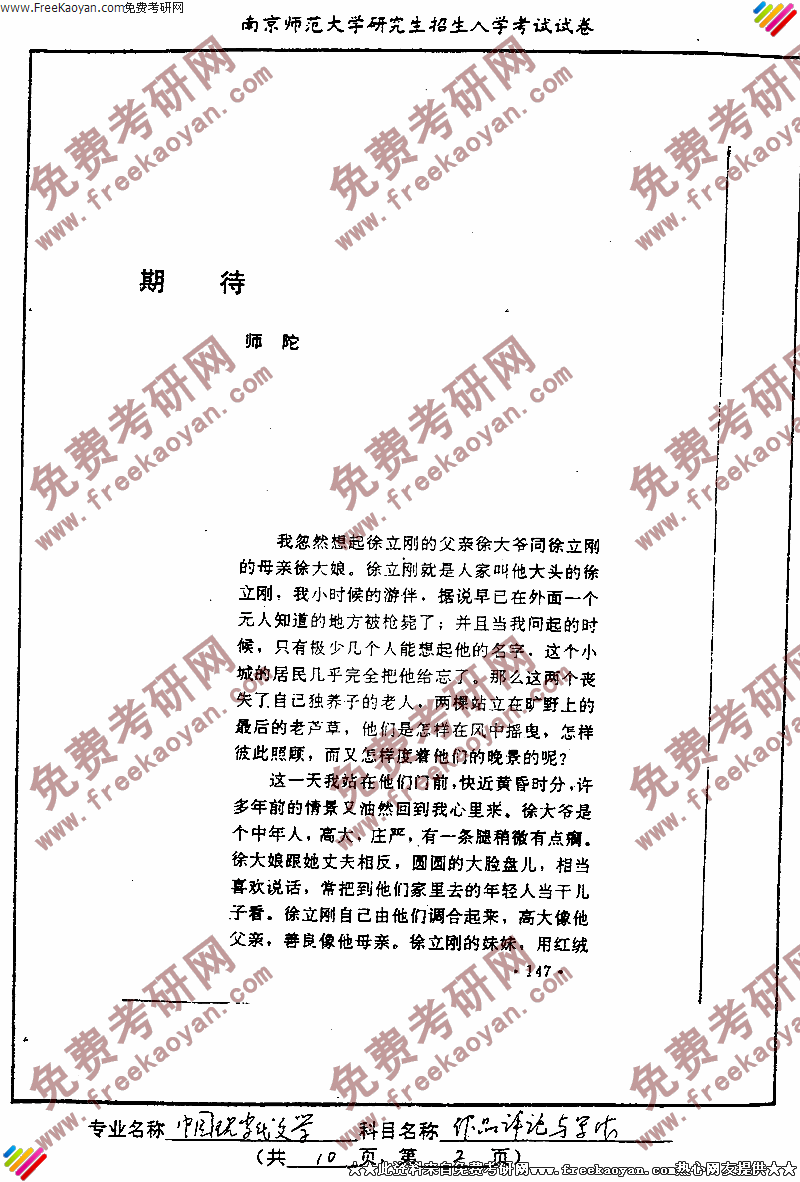 南京师范大学2003年考研真题-作品评论与写作(2)