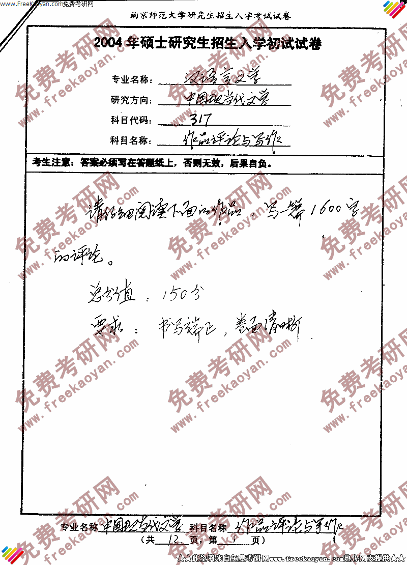 专业课考研经验 本站小编 FreeKaoyan 2018-01-22南京师范大学2003年考研真题-作品评论与写作