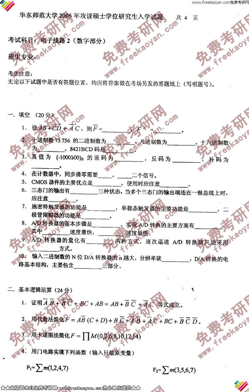 华东师范大学2005年考研真题-电子线路2(数字部分)