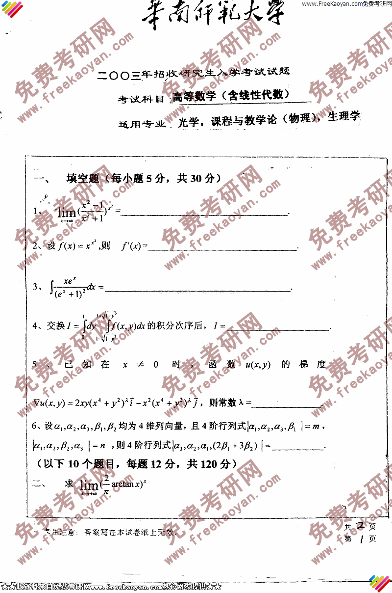 华南师范大学2003年考研真题-高等数学(含线性代数)