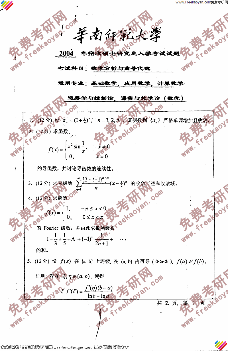 专业课考研经验 本站小编 FreeKaoyan 2018-01-22华南师范大学2004年考研真题-高等数学(含线性代数)