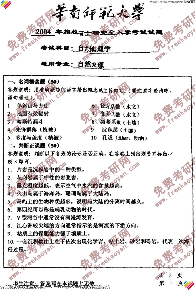 专业课考研经验 本站小编 FreeKaoyan 2018-01-22华南师范大学2002年考研真题-自然地理学