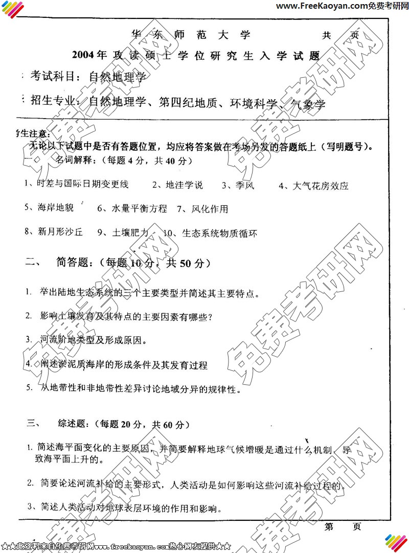专业课考研经验 本站小编 FreeKaoyan 2018-01-22华南师范大学2005自然地理学名词解释:第四纪 假整合 阶地 丰水年组 径流模数 河网密度 顶级群落 低位沼泽 爱伦定律 生物阻限简答:1、山地降水与海拔的关系 2、地面坡度和降水侵蚀的关系 为什么3、土壤资源破坏的表现方面论述:人类活动与自然地理环境的关系分析题 略 ...