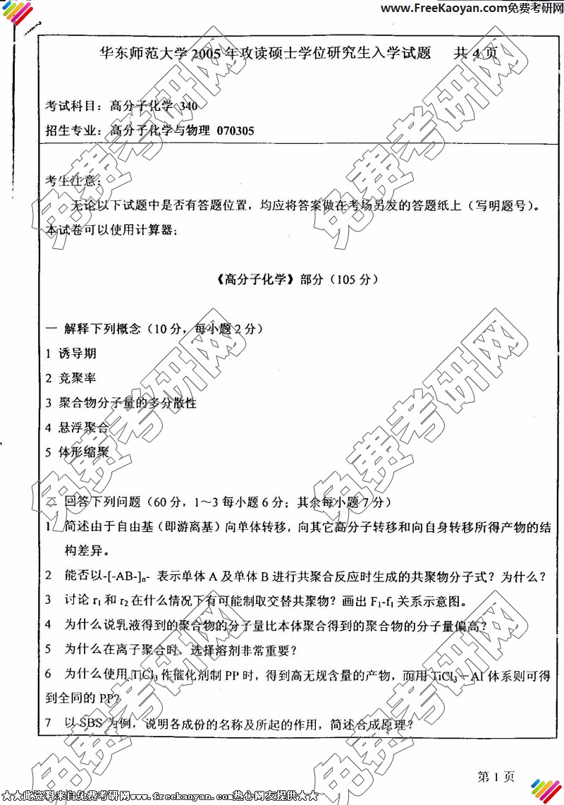 华东师范大学2005年考研真题-高分子化学