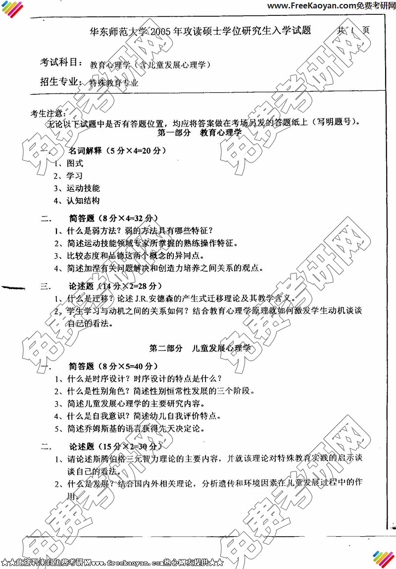 专业课考研经验 本站小编 FreeKaoyan 2018-01-22华东师范大学2005年考研真题-教育心理学