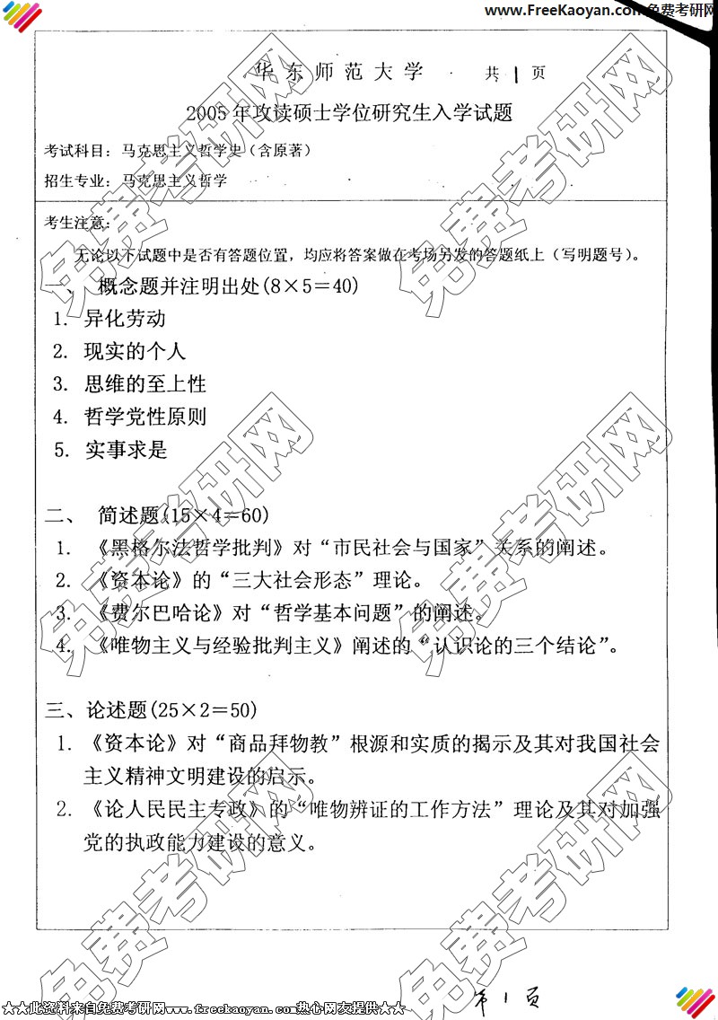 华东师范大学2005年考研真题-马克思主义哲学史(含原著)
