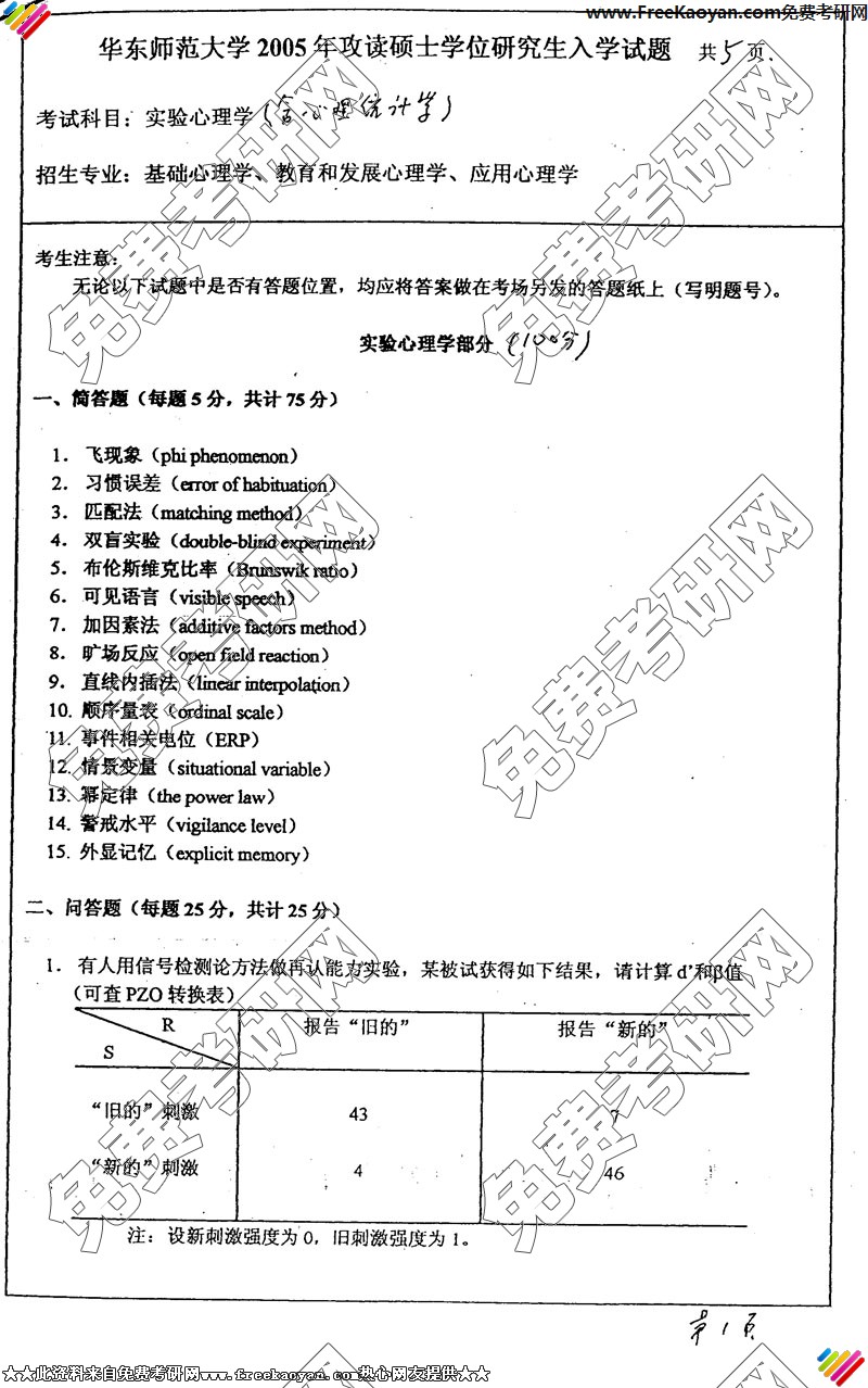 华东师范大学2005年考研真题-实验心理学(含心理统计)