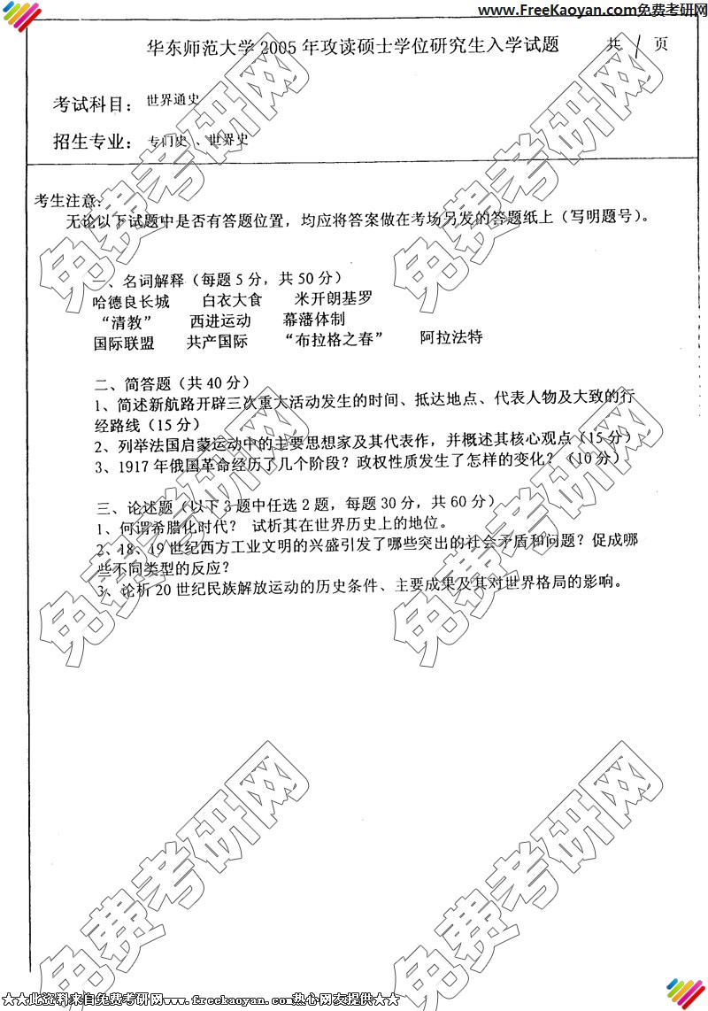 专业课考研经验 本站小编 FreeKaoyan 2018-01-22华东师范大学2005年考研真题-世界近现代史(至1945年)