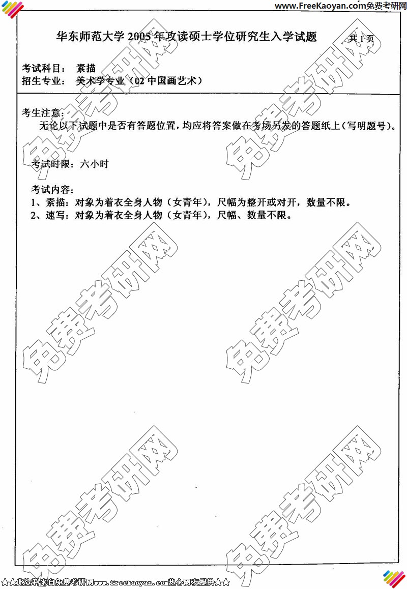 专业课考研经验 本站小编 FreeKaoyan 2018-01-22华东师范大学2005年考研真题-素描(西方艺术、现当代艺术方向)